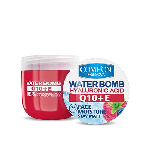 کرم آبرسان واتربمب حاوی کو آنزیم Q10 کامان comeon با دارا بودن هیالورونیک اسید باعث آبرسانی به پوست شده و رطوبت را در آن نگه می دارد. این محصول از بروز چین و چروک های پوستی جلوگیری کرده و علائم پیری زودرس را از بین می برد. این کرم مناسب انواع پوست است و چربی اضافه سطح پوست را تنظیم می کند.کرم واتر بمب به دلیل داشتن هیالورونیک اسید رطوبت پوست را به 98 درصد می رساند.